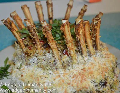 9) Spoon the rice mixture into the center of the rib rack up to the exposed bones height. Push the rice down with a spoon so you can fit more rice and have a solid base when you move the stuffed rack of lamb into a serving platter. Pack more Panko on the outside of the ribs. Place the rack in a 400°F. oven for 40 minutes. The rib rack is done when it measures 135°F inside of the ribs.
